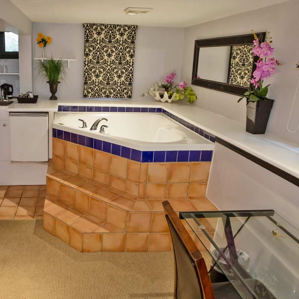 Part of our West coast heritage, this popular room reflects the Haida influence through original art pieces. Private ground floor entry queen size bed, large jet tub, lounge area with pullout couch, and ensuite bathroom.